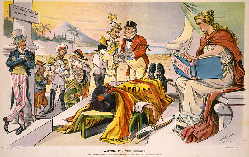 Caricatura que representa al Tío Sam (Estados Unidos) y a John Bull (Reino Unido), acompañados por las personificaciones de Alemania, Italia, Rusia, Austria y Francia, debatiendo junto al lecho de muerte de "España", con el arma del suicidio "Estupidez" al lado y la pluma de "Historia" lista para escribir. -